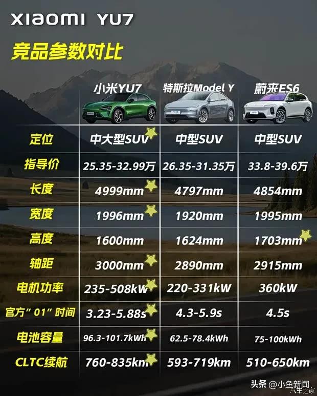 基于定价和网络舆情来看,小米YU7最直接的竞争对手应该就是特斯拉Model Y,但是你要从上边表格里得到的小星星数量来看,小米YU7无论是尺寸、电机功率、加速时间、续航明显要更占优势,再加上它媲美超跑般的造型以及小米和雷总的号召力,YU7已经完全具备了成为爆款的所有要素。或者从消费者的视角来看,在20-30万元这个价格区间,想找到一款设计、性能、空间、品牌认知度都出众的纯电SUV,小米YU7似乎是独一份的存在。