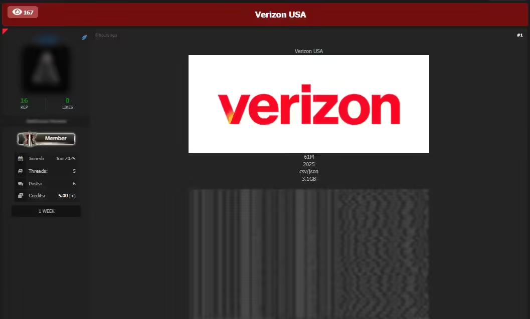 6 月 27 日,网络安全研究机构 SafetyDetectives 发布报告,称其团队在一个明网论坛中发现有人公开叫卖一份「包含 6100 万条 Verizon USA 客户记录」的数据库。