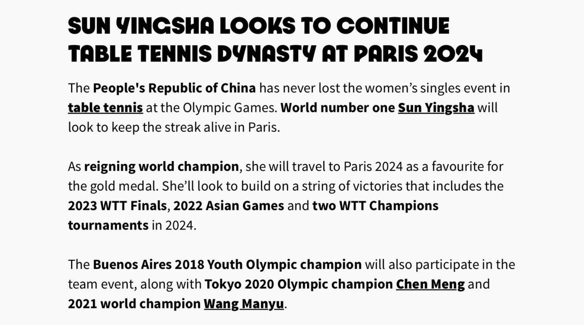 官方是这样说的:“期待孙颖莎在奥运会上延续乒乓球王朝”。