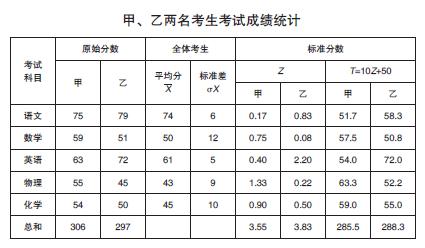 例如,甲、乙两名考生在某选拔性考试中,各学科成绩如图表所示。若以原始分数作为录取依据,当录取分数线是300分或者两名考生中只能有一人被录取时,应录取甲生(306分),而乙生(297分)落选。但将甲乙两名考生各科考试的原始分数转化成标准分以后,则录取结果恰好相反。