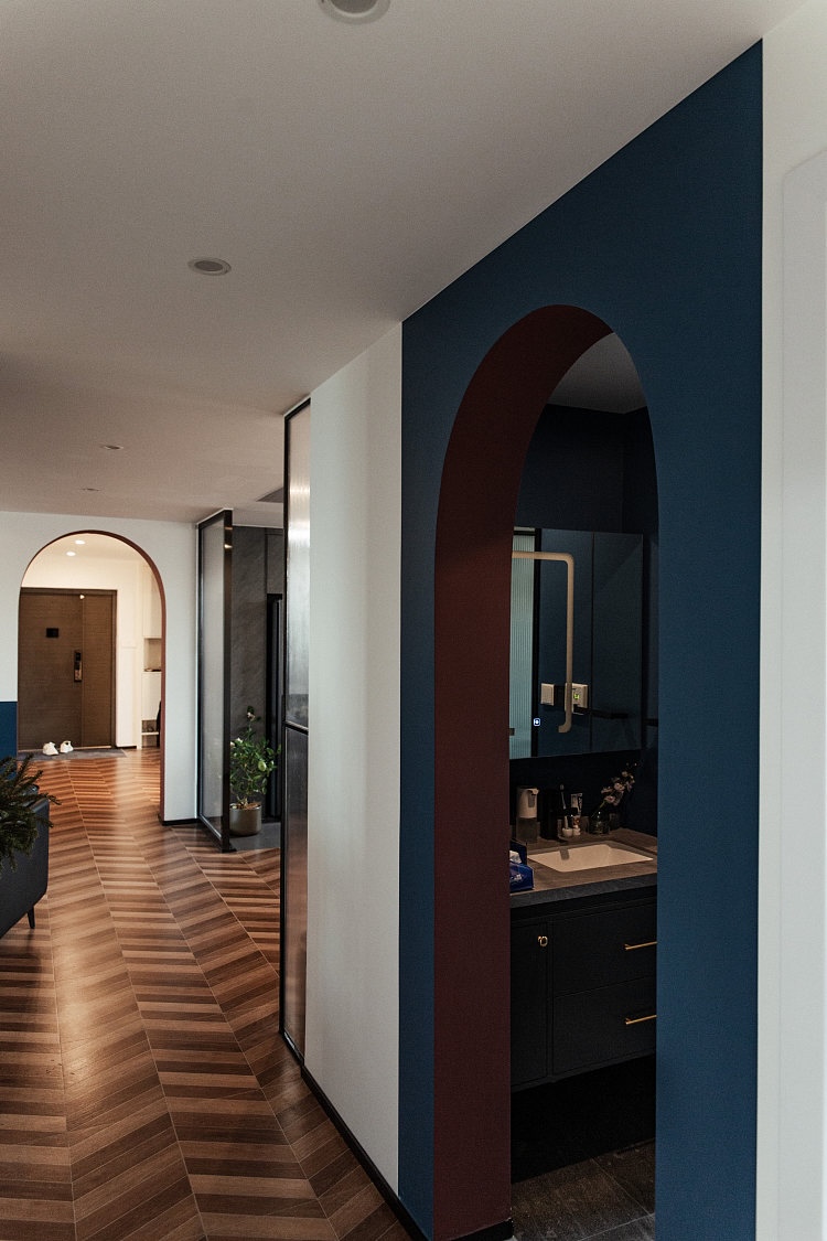 深蓝色,从玄关区延伸到整个主空间,呈现一派神秘、静谧的效果,非常吸引人。