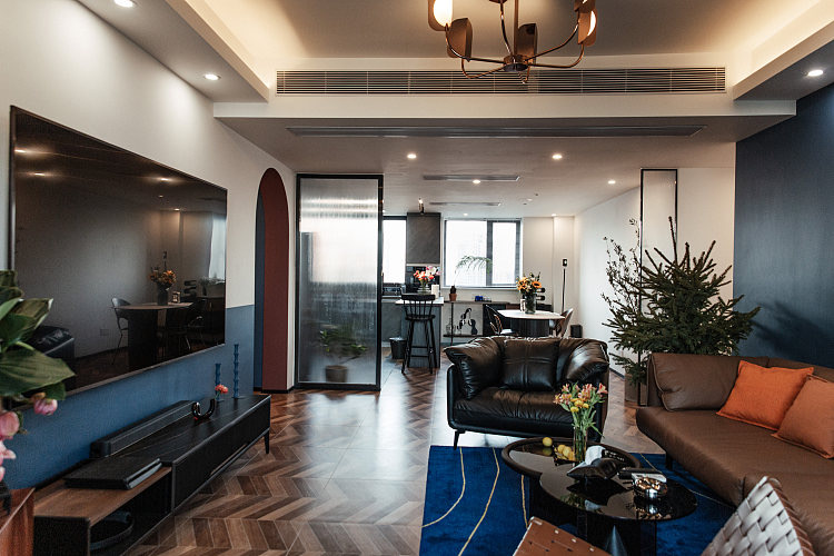 鞋柜的“复古蓝”和门洞结构的“砖红色”形成冷与暖撞色系对比,层次分明,在灯光的烘托下,显得格外高级。
