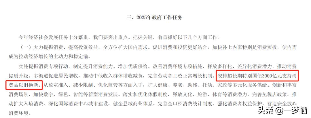 - 2025年消费品以旧换新支持资金高达3000亿元。