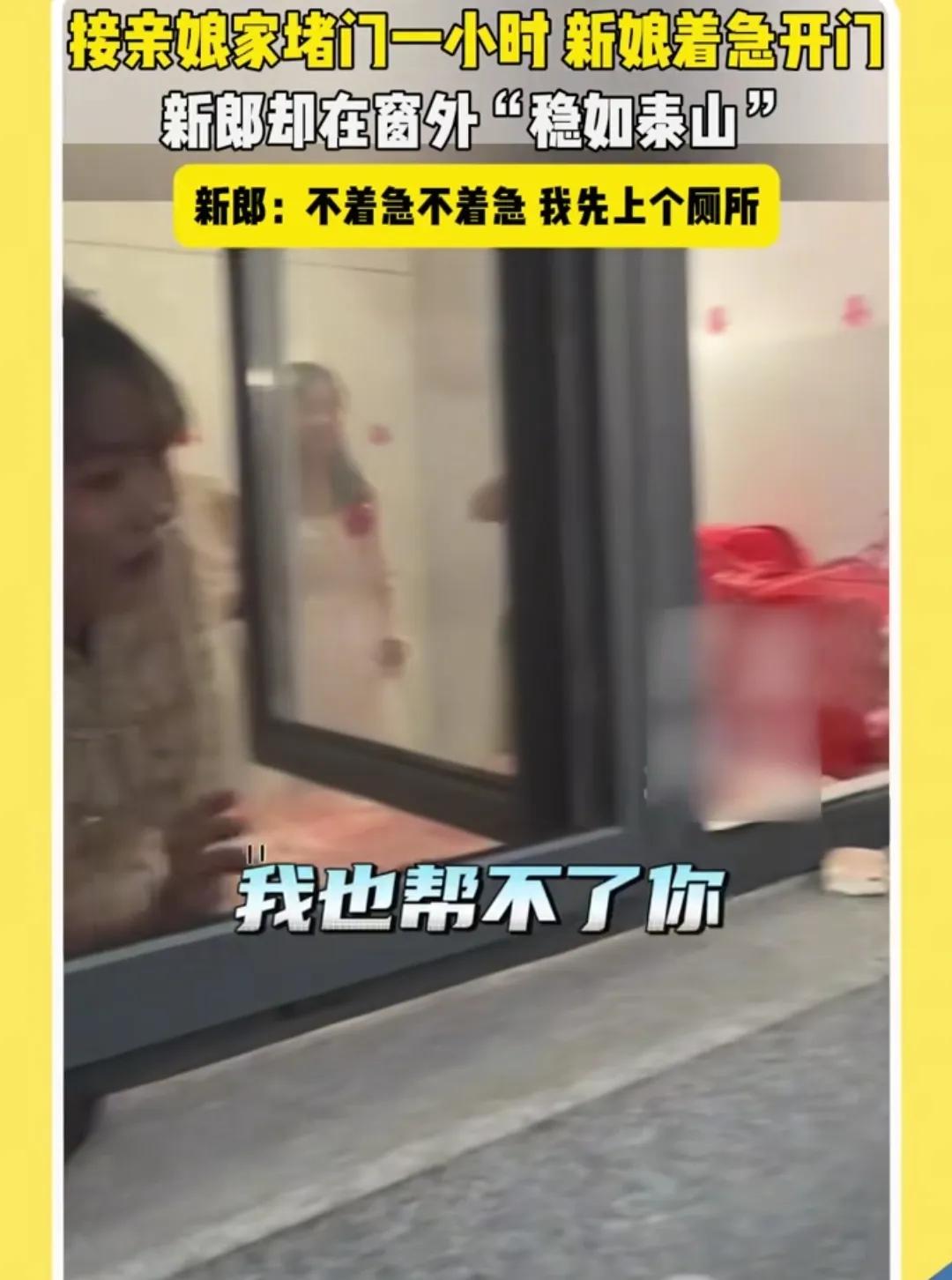 新娘显然更心急,隔着窗户频频给出“攻略”,让新郎换门试试、想法子破局,甚至催促他赶紧突破重围。新郎一看气氛有变,仍旧处之泰然,幽默回应:“咱们再等会儿,不差这点时间。”自顾自地转移了注意力,一句“我去上个厕所”,打乱了原本的“堵门攻防战”。很快,这份“不着急”的气度,让在场的女方家属也开始慌了阵脚,生怕新人真闹出不愉快。