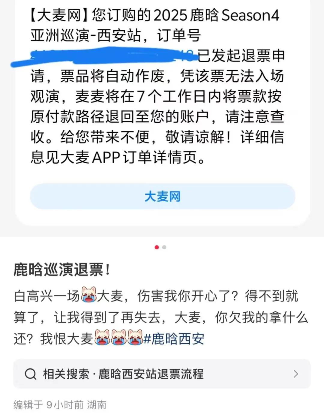 “非常抱歉,因为我方工作人员对优先权购票的时间配置错误,导致鹿晗西安站演唱会公开售票阶段(原定2025年6月29日19:07开始)未能正常开启。经过与主办方沟通,我们将对6月29日鹿晗西安站19:07后的购票订单做如下处理: