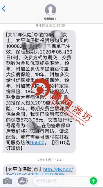 太平洋保险潍坊分公司:已退费,员工工作不严谨