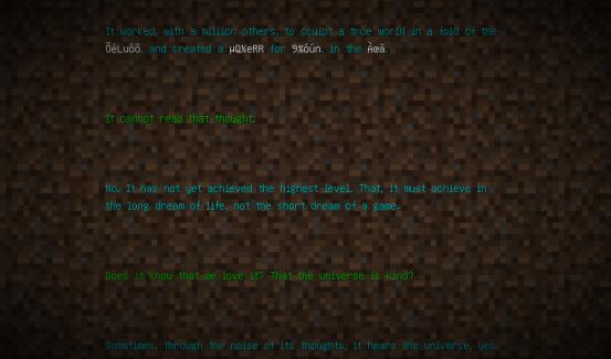 终末之诗的开篇这样写道:“我看到你所说的那位玩家了。是的。小心。他现在已达到了更高的境界。他能阅读我们的思想。无伤大雅。他认为我们是游戏的一部分。”