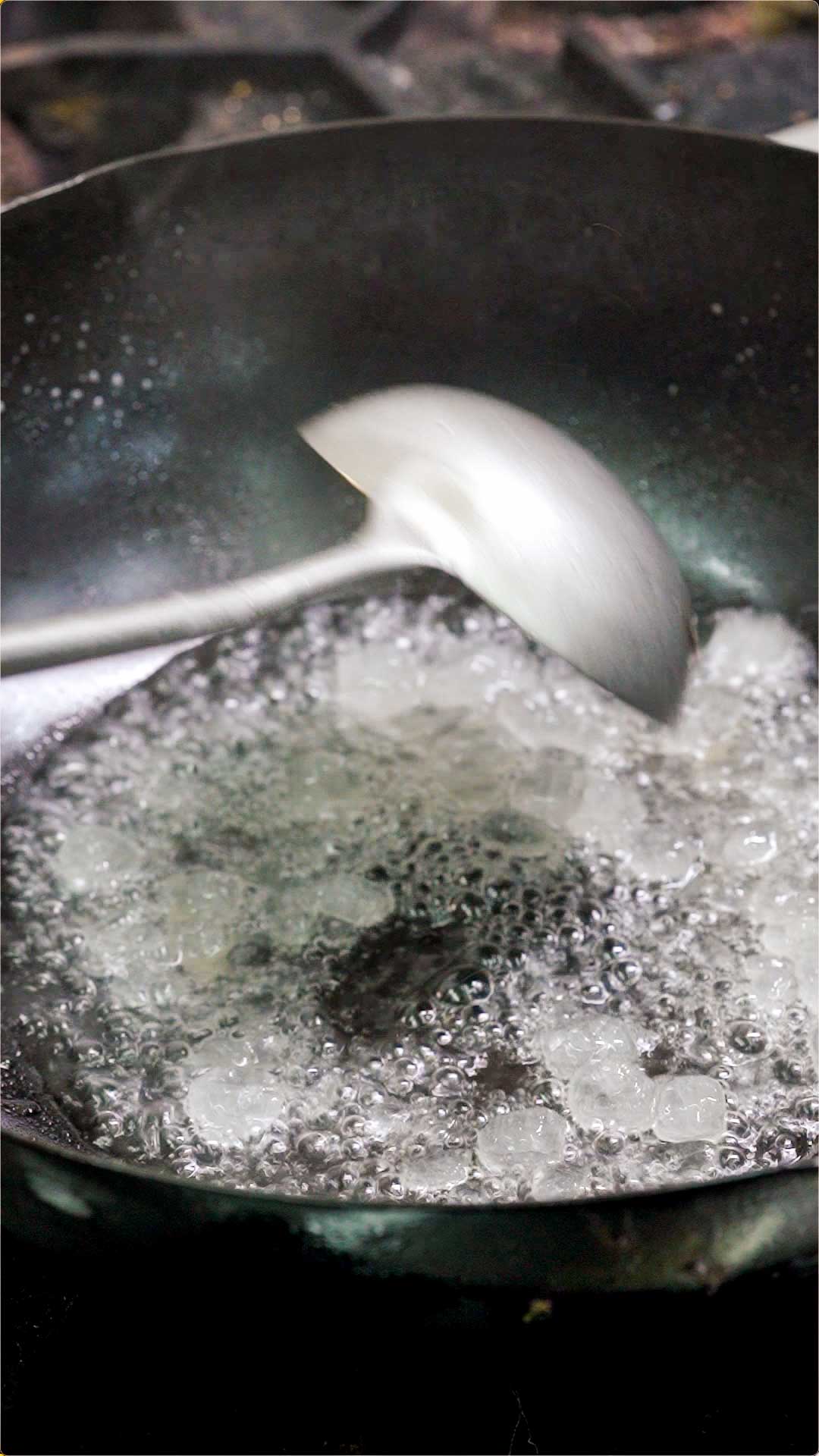开中火烧水,一边烧一边用筷子搅拌冰糖。