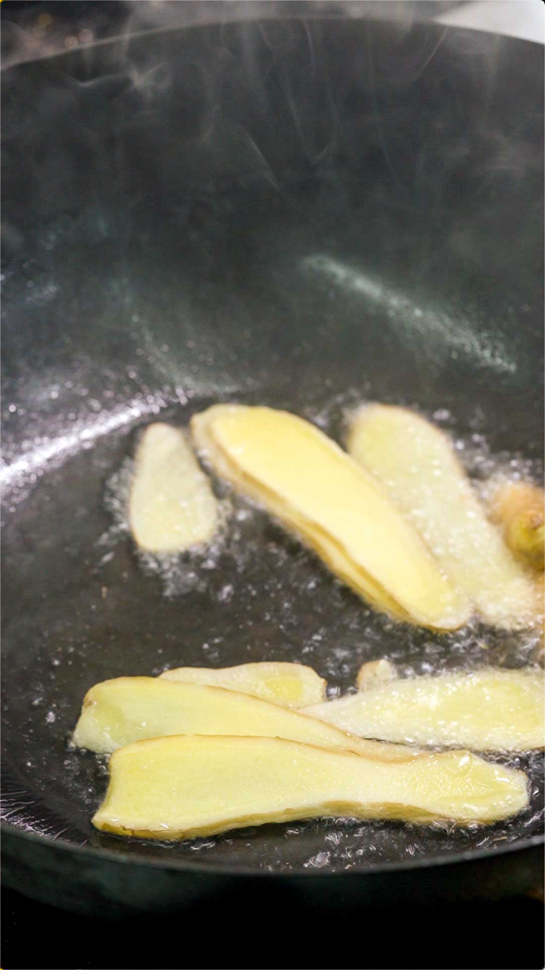 下入凉油后,我们在锅中加入20克的姜片,火调小一些用铲子把姜片煸炒出香味。然后加入40克的葱段继续煸炒,