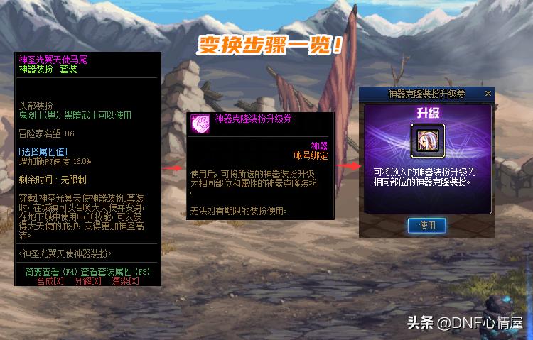 最后花1W金币,从商店买神器装扮变更券【神兽】,对克隆透明装扮使用,就可以变成一期龙袍!其实步骤很简单,光翼天使升级透明,透明升级神兽而已,没有太绕弯子,应该都比较清楚。关键在于神器克隆装扮升级券,这才是重点,商城足足要400R。