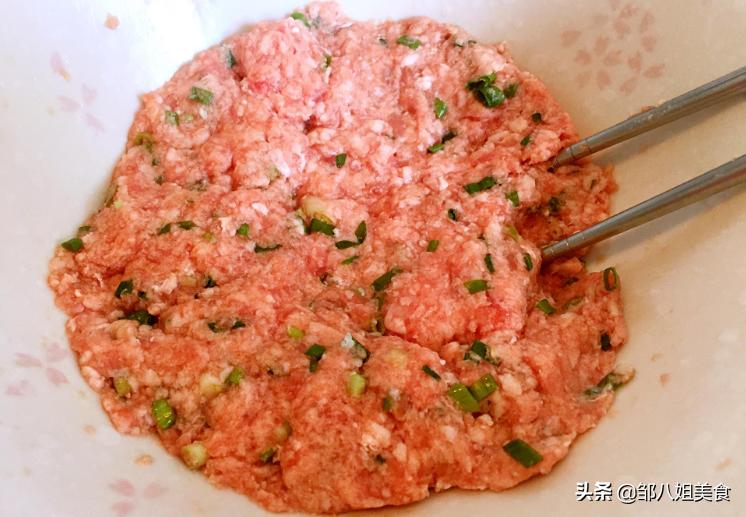 第一步是调肉馅,除了加盐等调味料外,还要加一个鸡蛋、少许水、少许淀粉,这样调出的肉馅很嫩,吃着格外香。否则外壳做得再酥脆,肉馅不好吃也白搭,所以不要只关注酥脆感,肉馅好不好吃也很关键。