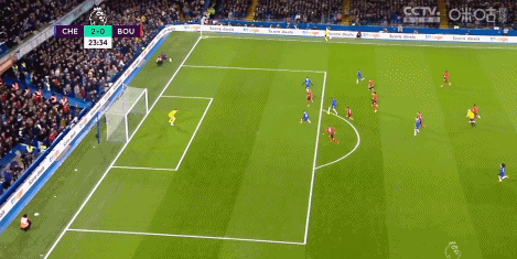 第16分钟,切尔西取得领先,连续两次传递将球打到前场右路,斯特林横扫门前,哈弗茨在后点倒地扫射破门,切尔西1-0领先伯恩茅斯。