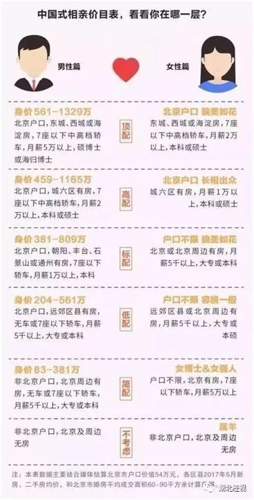 在北京上海等很多城市的公园中,都会有一个知名的相亲角,异地游客甚至会将之作为旅游景点前去参观。在这些相亲角中出现的人物,大多是到了所谓“适婚”年龄的年轻人,而相亲角中的出现的则几乎都是他们的父母。 很多人一听到这种形式,就会觉得这难道还不够物化吗,一个个丰富多姿而立体的人,变成了一行行的文字或是数字,双方当获得了进一步接触的机会时,也大多是因为这些文字和数字都令对方比较满意,而并非是两个人或深或浅的接触时散发的人格魅力的吸引。 之前有一条微博特别特别的火,是《凤凰周刊》调查了北京附近很多相亲角从而得出的一个结论,说相亲其实有一个价目单,每个人都是一场明码标价的买卖。