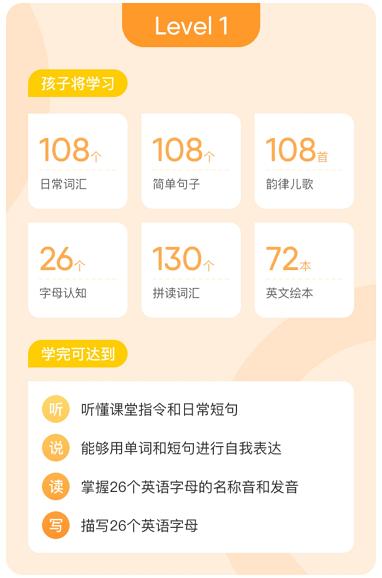 从L1和L2的课程内容来看,L1级别主要学习字母、儿歌、词汇、句子和绘本;L2级别注重简单对话和表达、自然拼读、指读绘本和单词句子的抄写。