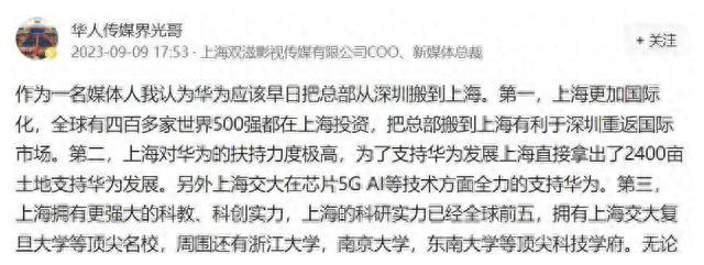 近日,一位名叫"华人传媒界光哥"的媒体人提出了一项颇具分量的建议,他认为华为应该考虑将总部从深圳搬迁至上海。这一建议的背后,蕴藏着着三大关键原因,这些理由支持着他的主张:上海拥有更高的国际化程度,有利于华为在国际市场的崭露头角;上海政府向科技企业提供了相对大力度的支持;此外,上海在科研领域和芯片制造方面拥有独特的优势。