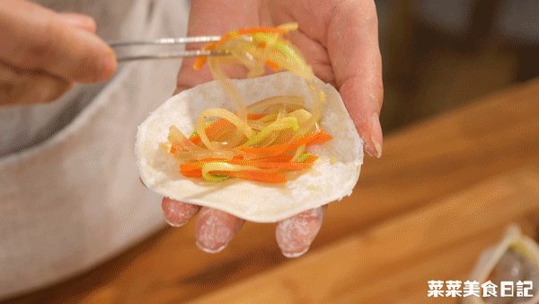 *蔬菜粉条提前炒过,不止可以入味,还更柔软,包起来更轻松,懒得炒也可以直接给蔬菜杀水,加调料拌匀即可