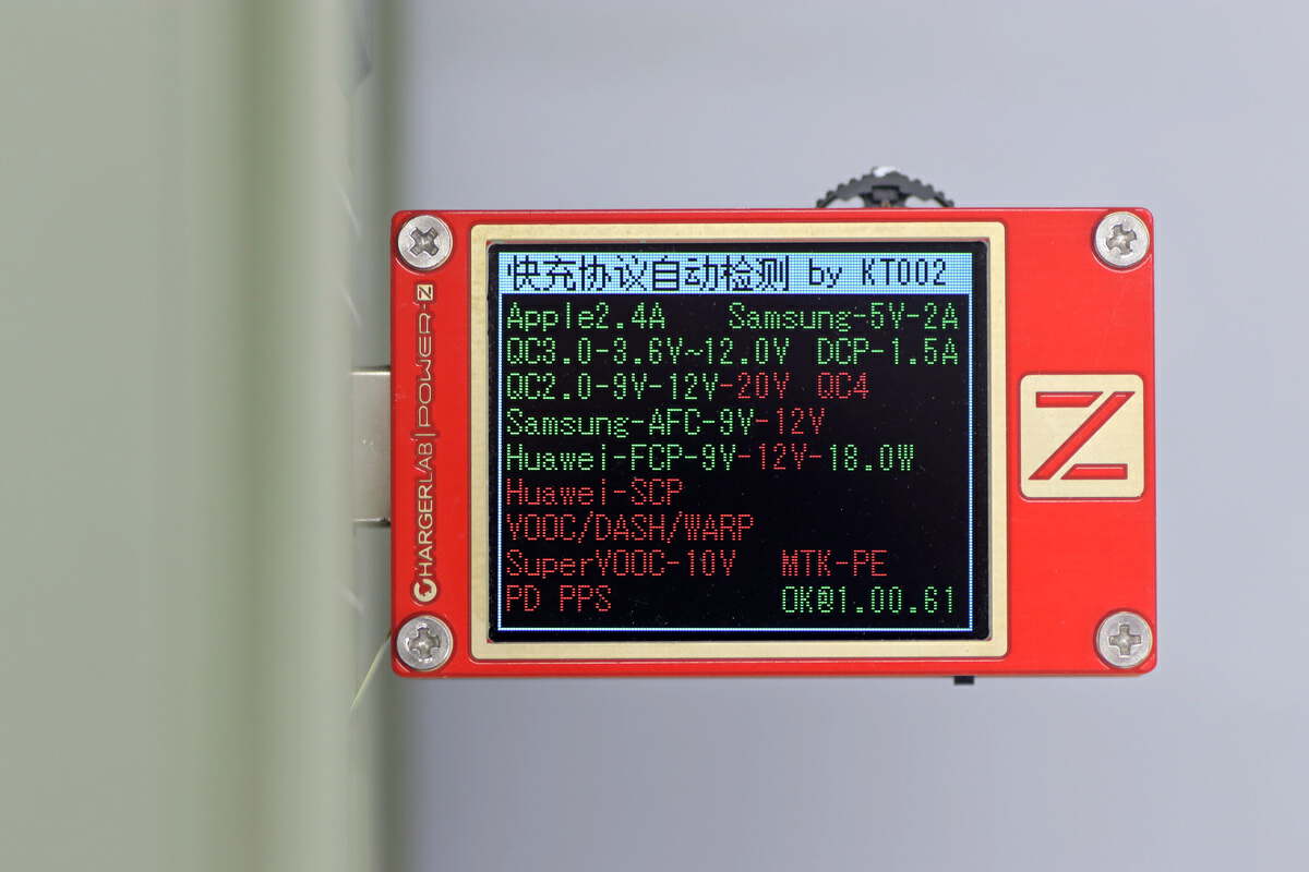 使用ChargerLAB POWER-Z KT002测得USB-A口支持Apple2.4A、Samsung5V2A、QC3.0、QC2.0、DCP、AFC、FCP多种协议。