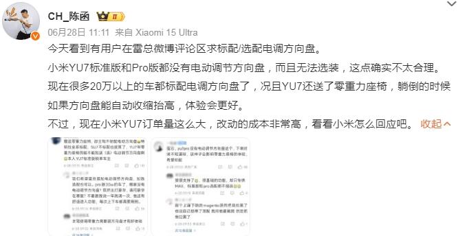 评论里,网友对小米此次答疑似乎并不是特别满意,呼吁其就“电动调节方向盘”问题作出解答。