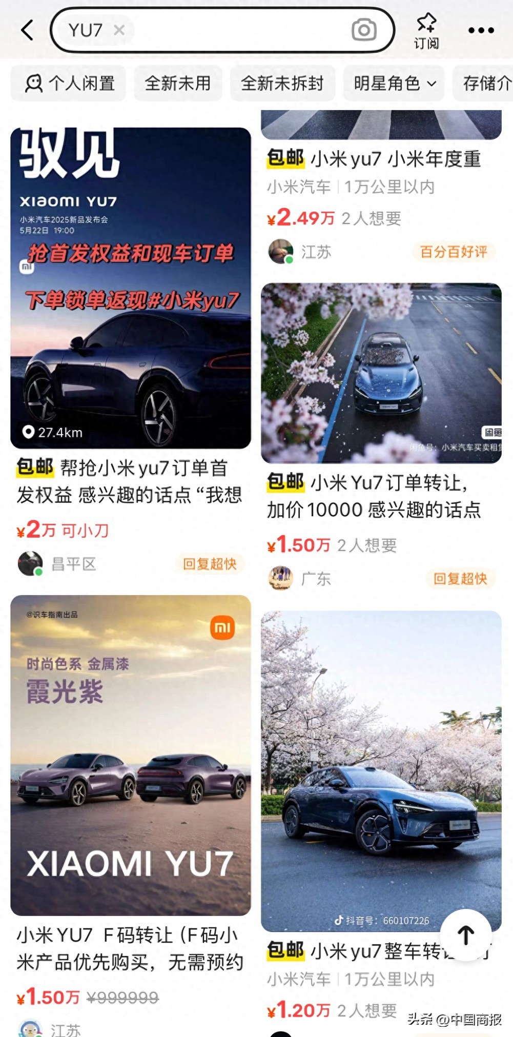 二手交易平台上大量涌现的代抢小米YU7订单。
