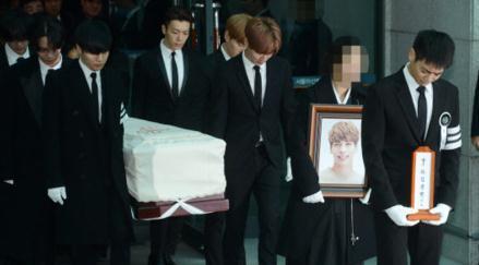 近日,SHINee主唱金钟铉因抑郁症而烧炭自杀的事件,令众多圈内好友以及粉丝心碎,更有甚者选择“随他而去”。在出殡这天,亲人好友沉痛悼念金钟铉,SHINee组合的成员、珉豪等也在今天为他送行,利特、东海、银赫为他抬棺。
