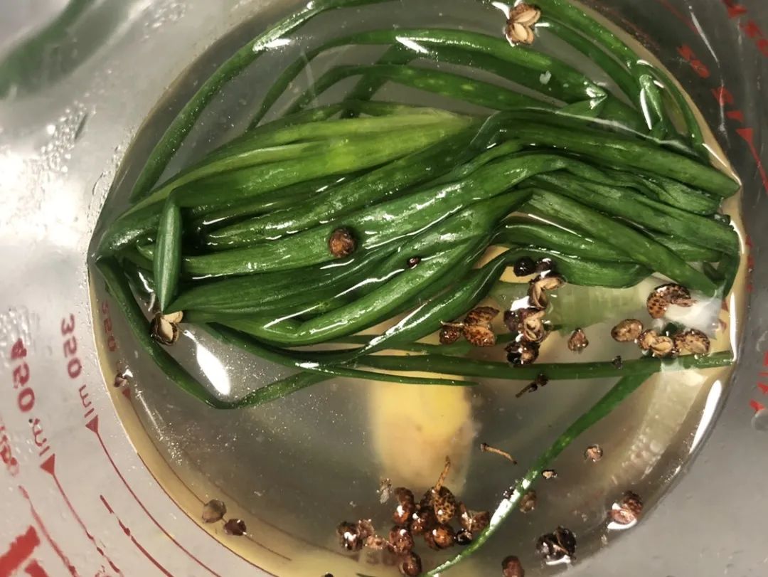 2.调制水料,姜块拍碎,一小把葱、少许花椒粒加入150ml热水中浸泡出味。