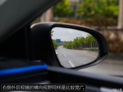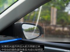 左右两侧外后视镜的横向视野范围比较宽广,表现同样值得肯定。相比之下,纵向视野范围就显得一般了,坐在车内的你无法很好地观察到低处的障碍物。另外,如果猛烈的阳光从前方照射过来,中控台的银色装饰条反光会比较明显,投射到副驾驶车窗的影子对右后视镜的视线造成了一定的影响。