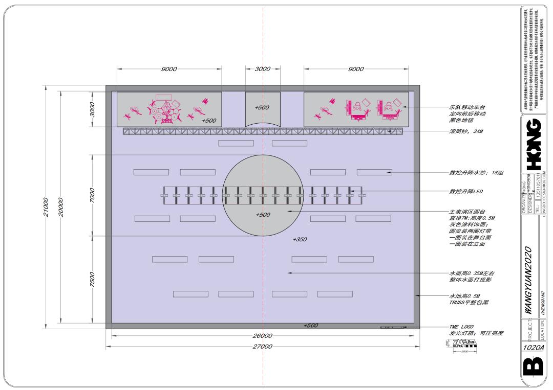 在敲定具体的呈现方式时,规避了一些不可行的方案,最终选择营造一个水的氛围,让现场能更偏舞美一些,可以除水之外,还能有一些其他的舞美效果。