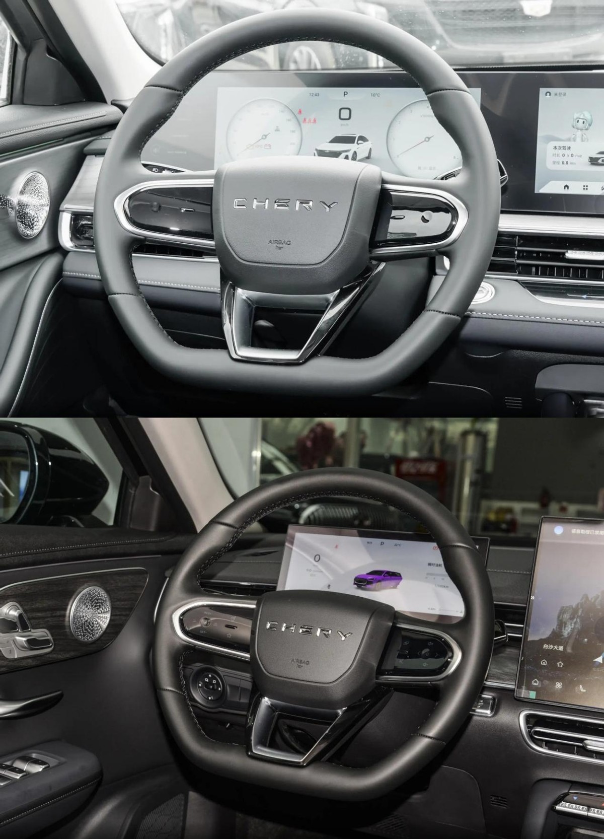 两款车的内饰设计与功能区别蛮大,其中像方向盘造型、用料和挡杆安排等方面基本一致,但在细节上,艾瑞泽8 PRO豪华型的中控台左出风口,升级成了物理功能按键,而无钥匙一键启动按键换成了矩形设计,方向盘调节杆也做了细致的加厚,而且中控屏布局也不同,艾瑞泽8睿运用了12.3英寸仪表盘+12.3英寸车机双屏联动设计;而艾瑞泽8 PRO则采用了10.25英寸仪表盘+15.6英寸的悬浮式中控屏,这是内饰差距最明显的一处。