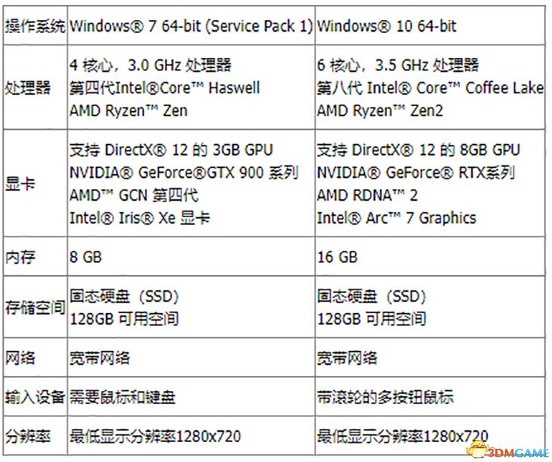 | 显卡 | 支持 DirectX® 12 的 3GB GPU NVIDIA® GeForce®GTX 900 系列 AMD™ GCN 第四代 Intel® Iris® Xe 显卡 | 支持 DirectX® 12 的 8GB GPU NVIDIA® GeForce® RTX系列 AMD RDNA™ 2 Intel® Arc™ 7 Graphics |
