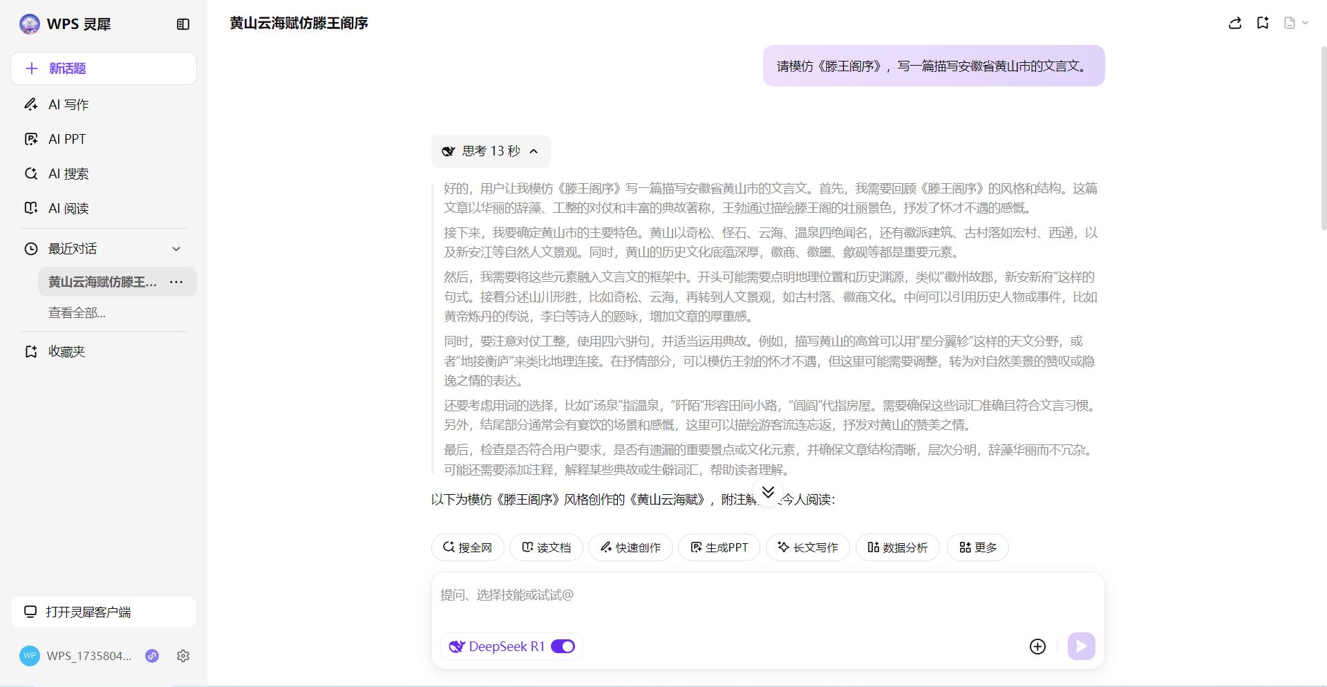 WPS接入DeepSeek后不仅可以用来写文案等创作,还能上传文件、生成PPT、数据分析和生成思维导图等。