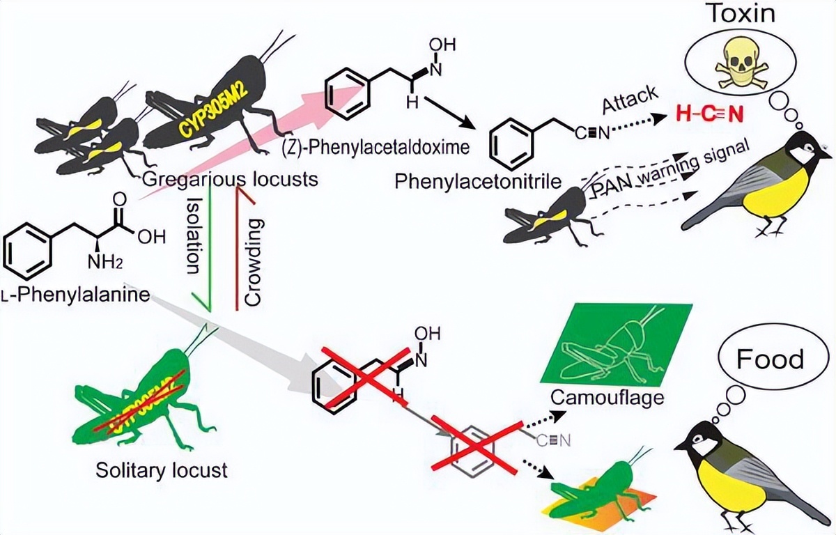 这是在普通蝗虫身上没有检测出来的,通过进一步的研究,科学家们发现原来是蝗虫中编码CytP450氧化酶的基因CYP305M2催化产生的苯乙腈,这可能也是让蝗虫从独居变成群居的一个重要原因。