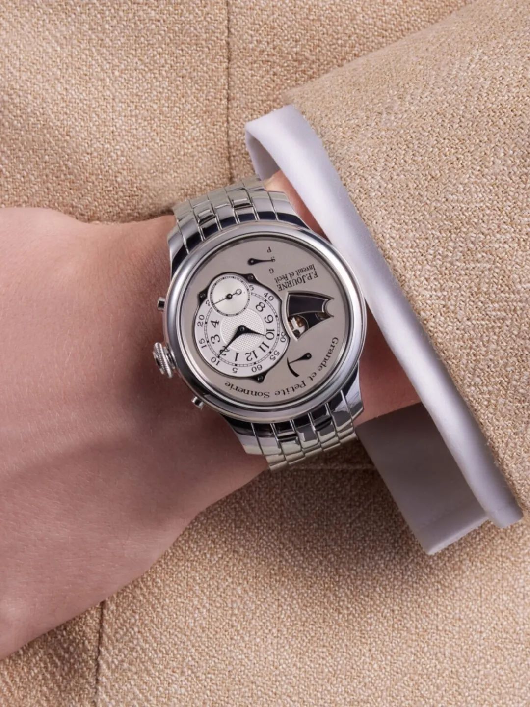 独立制表品牌F.P.Journe,这次的拍品个个比王室珠宝更稀罕。这块精钢自鸣三问腕表,大小自鸣报时功能堪称机械制表的巅峰挑战。作为F.P.Journe耗时6年研发的结晶,它搭载多项专利技术,将自动报时的大小自鸣及三问功能熔铸于直径42毫米的钢壳内,颠覆了传统复杂功能的笨重印象。