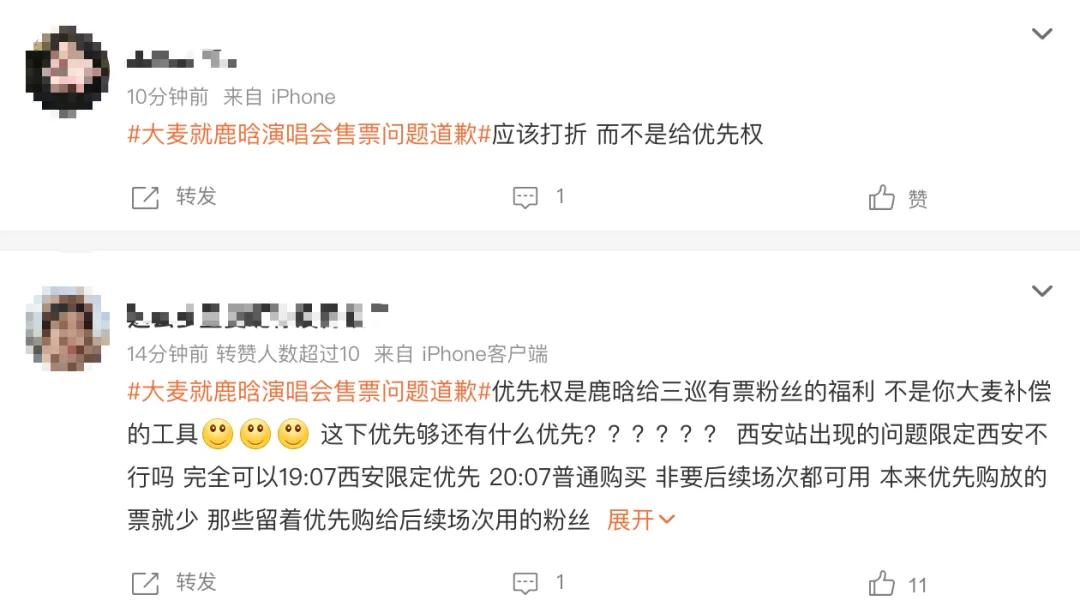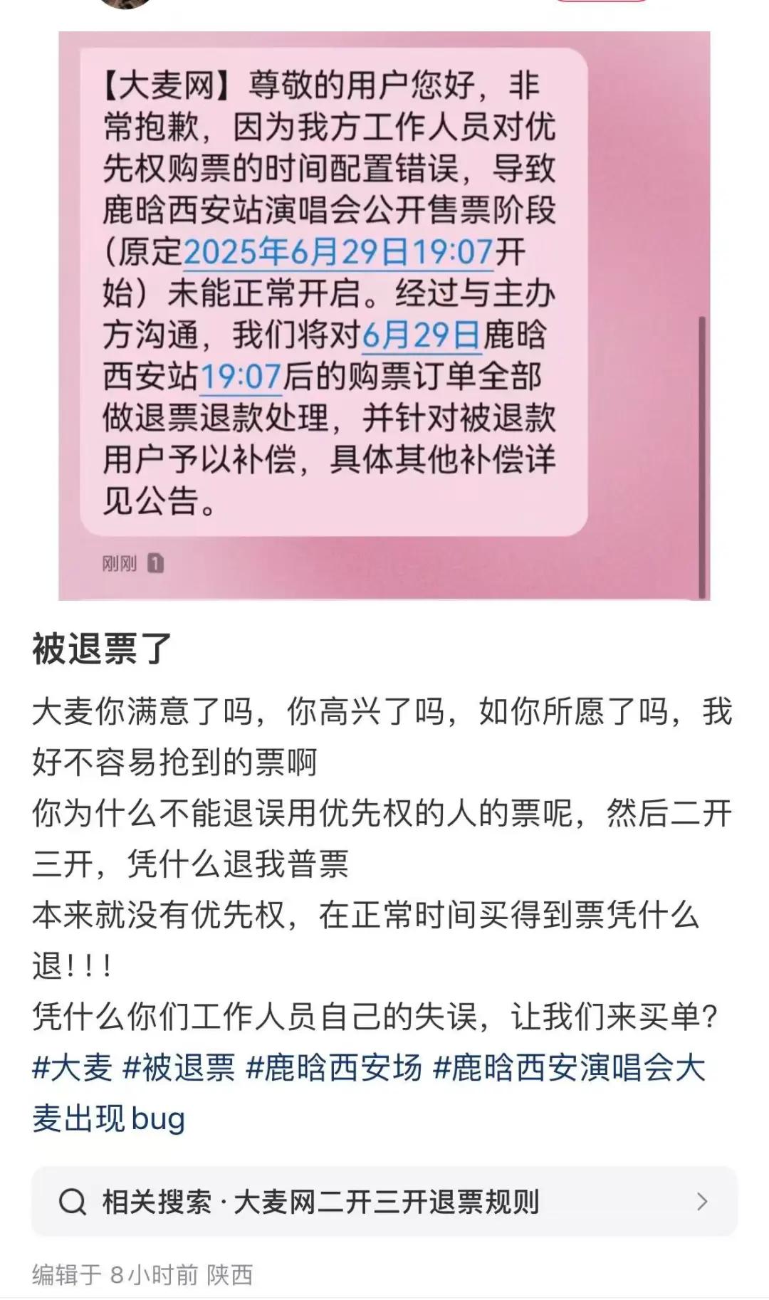 据此前报道,昨天,大麦网疑似出现bug。不少网友反映,在抢购鹿晗西安站演唱会门票时,原定18:07为优先权购票、19:07为普通场次抢票,但普通场次抢票时段仍仅开放优先权通道。普通用户点击后显示“无抢票特权”,导致无法购票;而部分用户未计划在西安场使用优先权,但因系统bug被迫消耗唯一特权资格(每个账号仅一次),影响后续场次抢票机会。