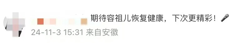 11月2日,广东江门,星耀湾区演唱会江门站,据现场歌迷视频,原定阵容嘉宾容祖儿因身体原因失声,未能正常演唱,向粉丝道歉。