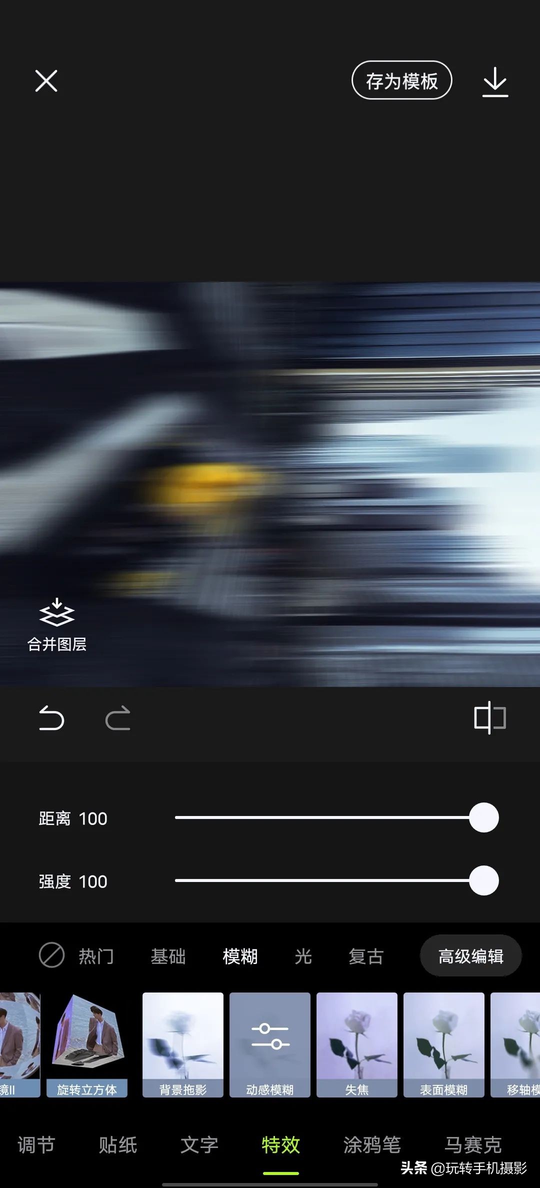 同样我们再点击「高级编辑」,添加「动感模糊」特效,距离和强度拉至100;根据相同操作,增加3~4个动感模糊就完成了。