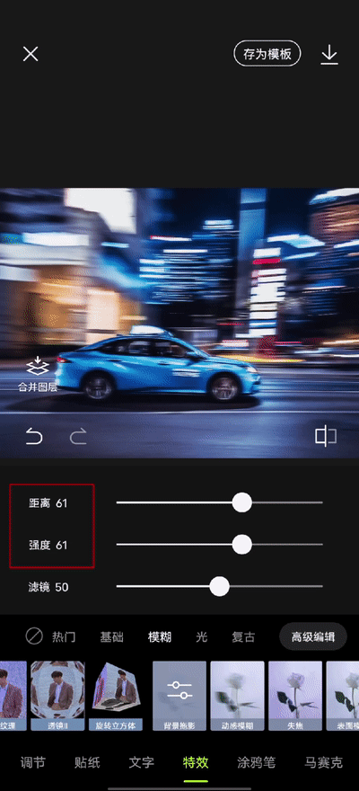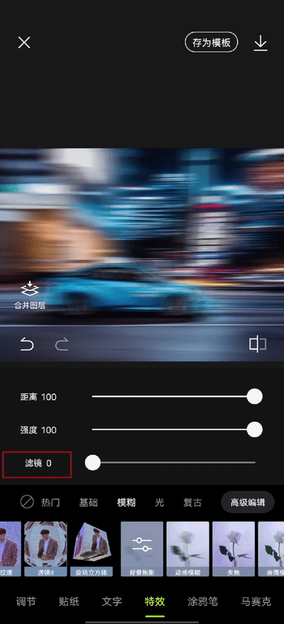 同样点击「特效」➟「模糊」➟「背景拖影」,拉高距离和强度,调节滤镜,点击「高级编辑」,叠加「动感模糊」特效,让画面充满动感。