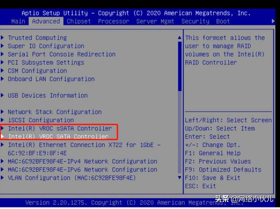 选择advanced —— Intel VROC SATA(sSATA)Controller,根据板载控制器种类不同,选择对应的选项。