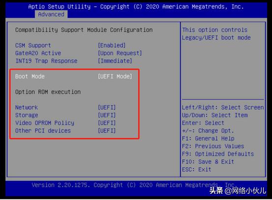 Boot Mode,Network,Storage,Video Oprom Policy,Other PCI devices 的Option ROM 的执行方式建议设置为UEFI
