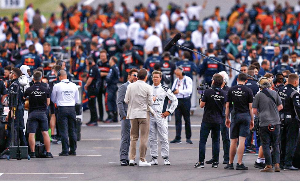 影片拍摄于 2023 年和 2024 赛季的多个大奖赛周末期间。电影里的第一个和比赛相关的重大场景,就是2024 年 7 月在英国银石赛道举行的英国大奖赛正赛开始前例行奏唱国歌时,皮特和扮演他队友的男演员,凑到车手队列边上“蹭镜头”拍摄的,能够把全世界开车最快的20个人都找来充当背景板,也只有这部电影能够做到。