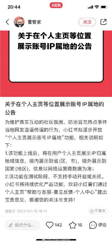 4月15日晚间,小红书发布公告称,为维护真实互动的社区氛围,防治冒充热点事件当地网友造谣传谣的行为,拟逐步开放“个人主页展示账号 IP 属地”功能。