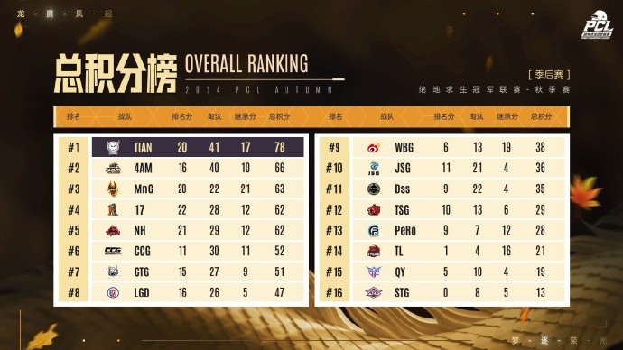 最终,天霸三日分别拿到61分、45分、51分,外加17分继承分,共174分成功夺得PCL2024秋季赛冠军!