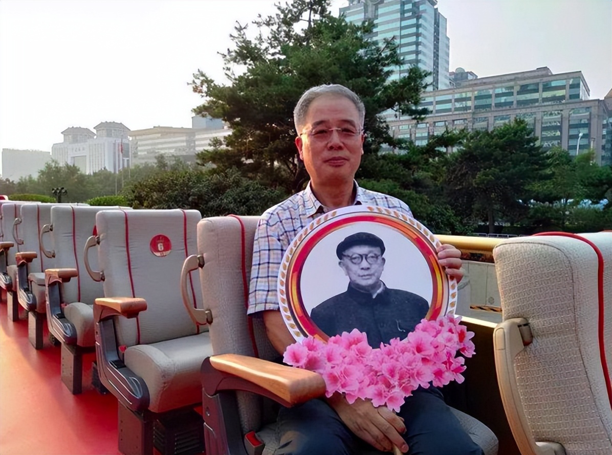 国庆70周年群众游行的“致敬方阵”中,许进举着祖父许德珩的荣誉牌。