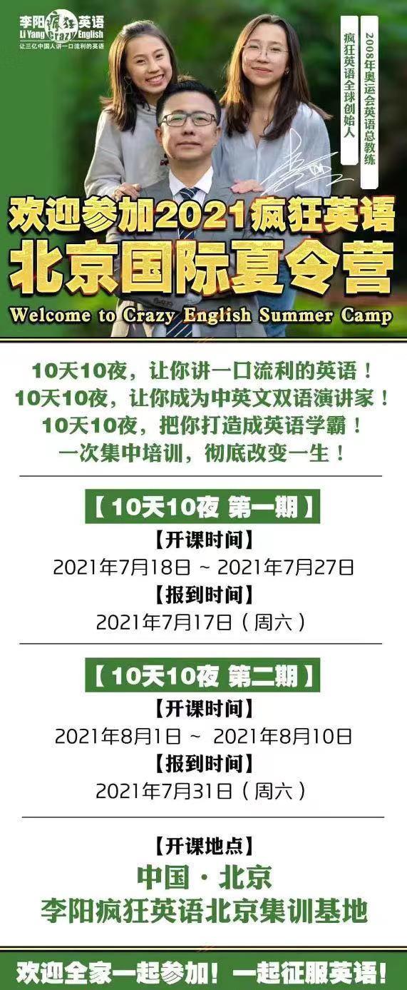 8月,疯狂英语还曾开设过国际夏令营,宣称“10天10夜让你讲一口流利的英语”。根据课程介绍,学员们每天要学习14个小时,要背完英语才能吃饭睡觉,还会和“李阳老师一起晨跑、一起大喊英语”。
