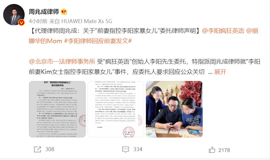 同日,李阳的代理律师周兆成发布声明称,作为代理律师,其正式代表委托人李阳无条件向公众道歉。声明称,家暴的说法系双方在女儿“教育方式上存在误解” 所致,经律师团队多方调查查证后,该指控并不属实。其还称,8月29日Kim发布的视频存在恶意剪辑。