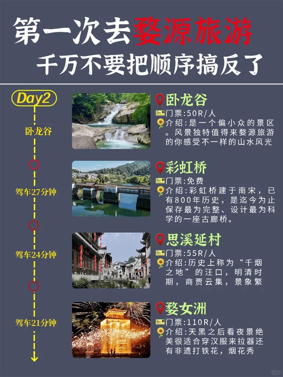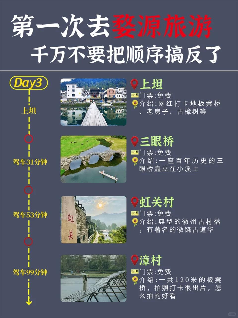 · 篁岭:145元/人,晨8:30-17:30营业,建议3-5小时游览