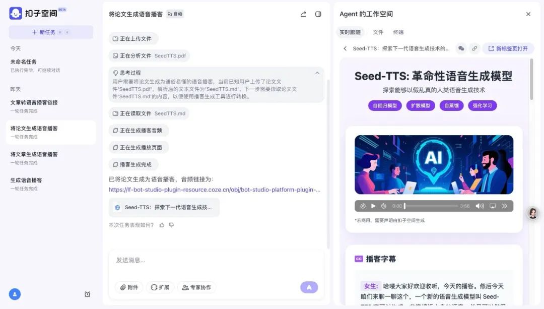 例如,将字节跳动Seed-TTS团队一篇18页的英文技术论文发送给豆包或扣子,即可收获一段两人对谈讲解论文的中文播客,时长3分56秒。开头的前奏音乐也由播客模型自动生成,两位AI主播对话的过程中,男女声的音色与音调都比较自然,还会模仿人说「然后」「这个」等连接词,自然程度堪比OpenAI去年5月发布GPT-4o模型时展示的对话能力。