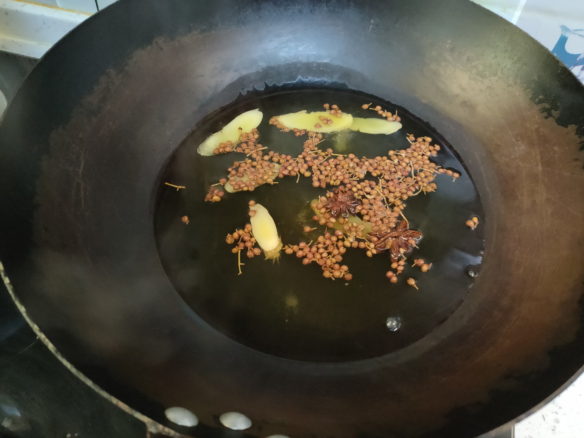 调料:干花椒3克、八角两颗、姜片少许、葱花适量、盐适量、生抽酱油10克、蚝油10克、五香粉5克、白胡椒粉2克、料油适量、老抽少许。