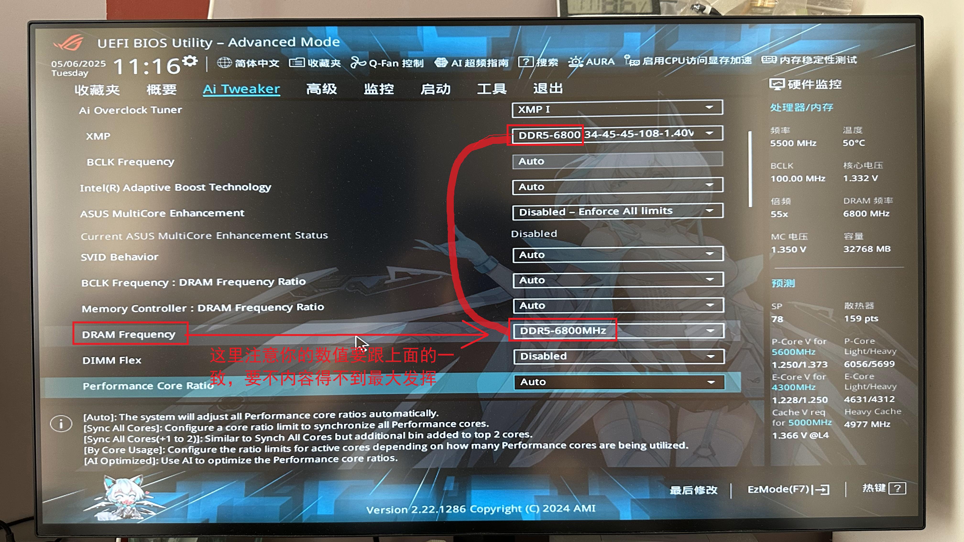 再往下拉找到【DRAM Frequency】设置改为【“与你上面内存型号一致的选项”例:DDR5-6800mHz】