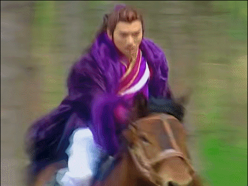 那个年代但凡是以古装出圈的男演员,基本上都能在马背上展现自己的风姿,赵鸿飞在《君子好逑》里骑着一匹性子极野的马驰骋在丛林里,侠气冲天。