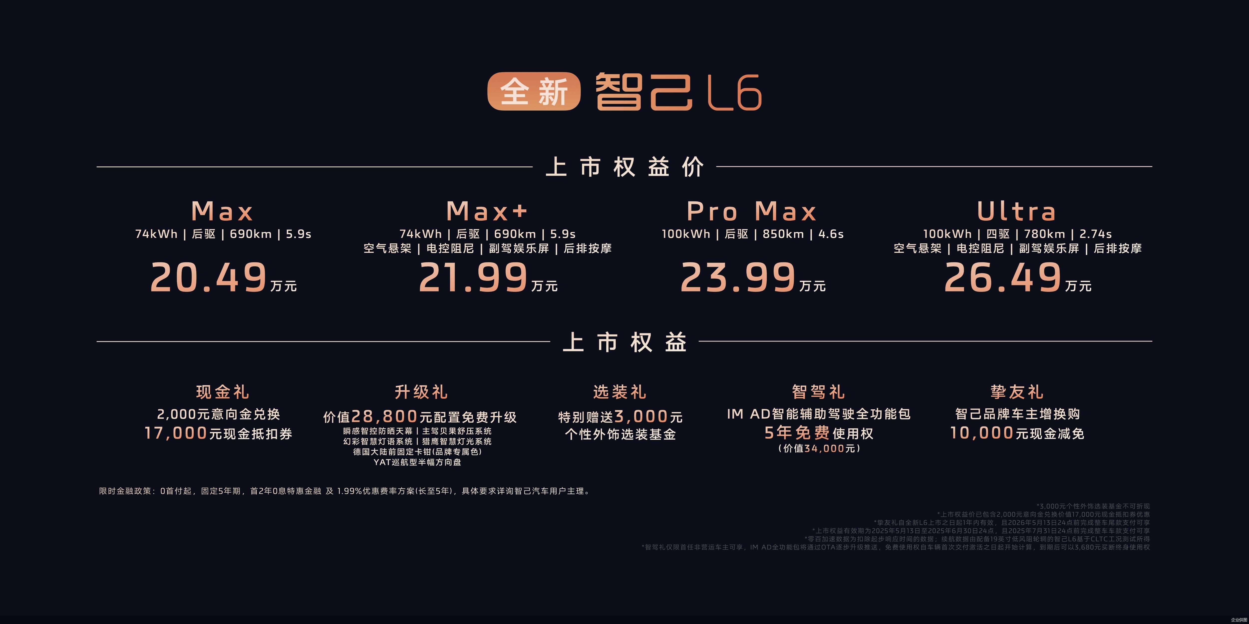 北京商报讯(记者 刘洋)5月13日,全新智己L6正式上市,共推出Max版、Max+版、Pro Max版以及Ultra版四大配置版本车型,官方指导价为21.99万—27.99万元,限时权益价为20.49万—26.49万元。